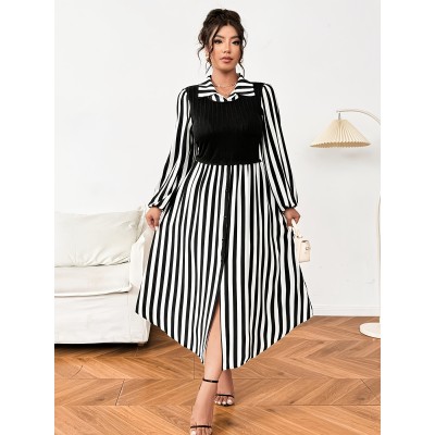 プラスサイズ - プラスサイズ - エレガントなプラスサイズストライプドレス - ブラック&ホワイト垂直ストライプ